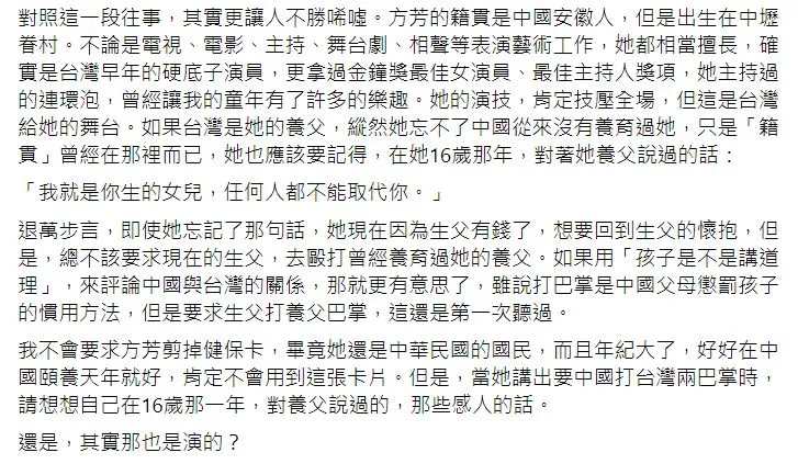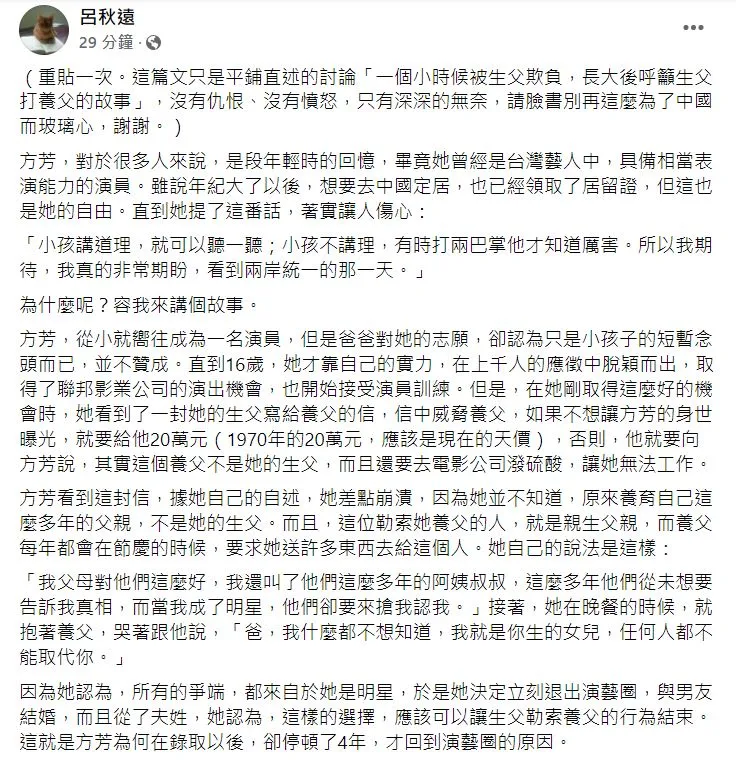 呂秋遠在臉書文中提及方芳年幼時嚮往成為演員,但卻得知自己非養父親生,生父威脅養父大筆現金,若不辦就要曝光她的生世還要到她公司前潑硫酸,令她當時非常崩潰。呂秋遠說,方芳籍貫為中國安徽人,出生於中壢眷村,她的演技,肯定技壓全場,但這是台灣給她的舞台。