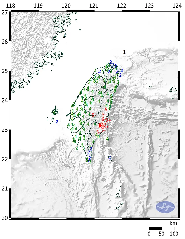 根據氣象局觀測,下午2點44分發生的6.8地震,震央在台東池上,深度僅7公里,台東池上震度達到6強,花蓮玉里6弱,南投玉山5弱,台東市、嘉義縣、高雄市、台南市、雲林縣、南投縣、台南市、彰化縣、嘉義縣、台中市、花蓮縣、新北市、宜蘭縣等都達到4級。