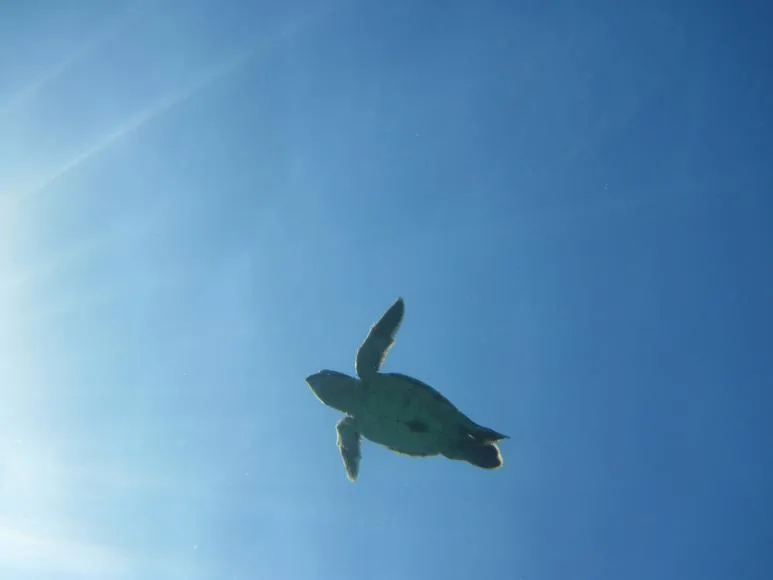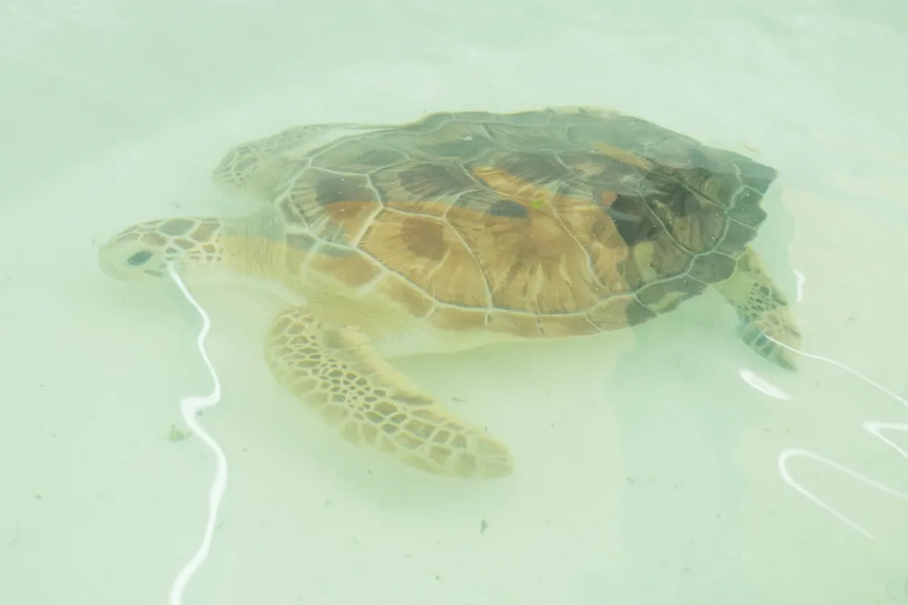 成長中的小海龜很親人,有時還會主動游過來向人「討摸」,像是小貓小狗一樣呢。我盯著海龜的桂圓核兒黑眼珠,牠也抬頭看看我。