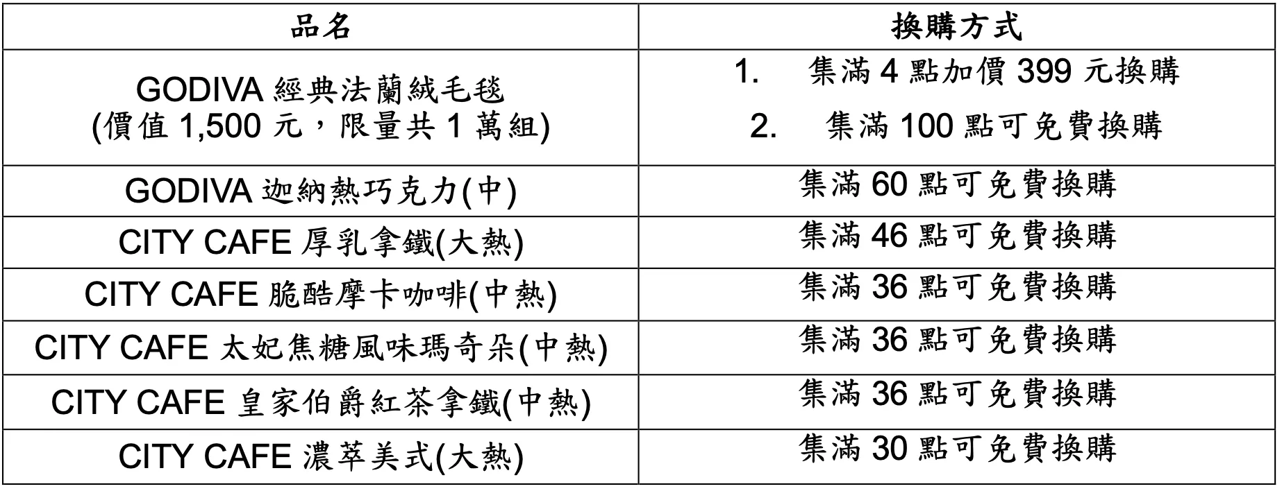 另外,集滿 30 點以上也可選擇免費換購 CITY CAFE 指定飲品,包含濃萃美式、厚乳拿鐵、脆酷摩卡咖啡、太妃焦糖風味瑪奇朵、皇家伯爵紅茶拿鐵及 GODIVA 迦納熱巧克力等指定冬季熱飲,CITY CAFE 於冬季時節啜飲暖心滋味。